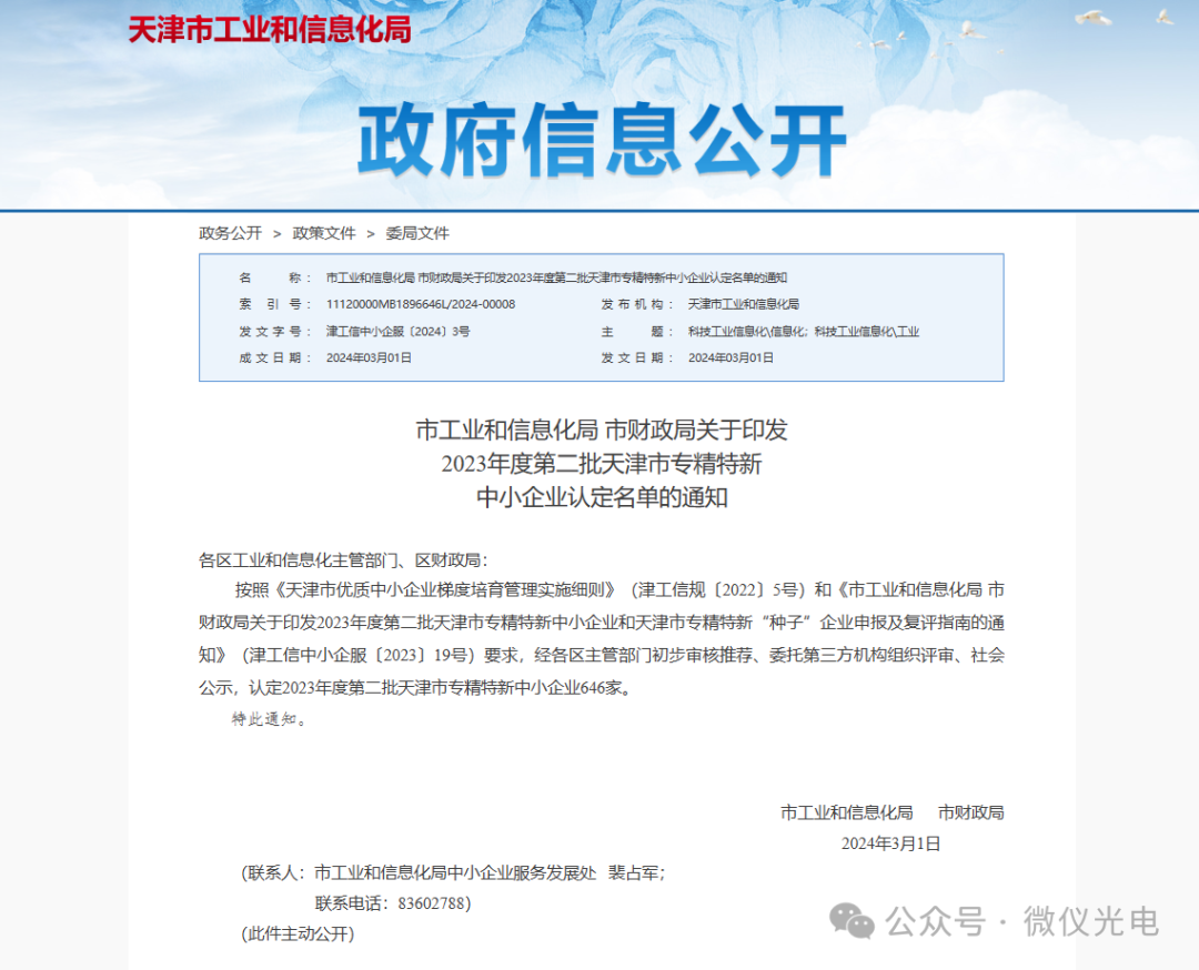 2024年3月1日,天津市工業(yè)和信息化局官方網(wǎng)站發(fā)布了《市工業(yè)和信息化局 市財政局關于印發(fā)2023年度第二批天津市專精特新中小企業(yè)和天津市專精特新“種子”企業(yè)申報及復評指南的通知》,微儀光電(天津)有限公司(以下簡稱“微儀光電”)榜上有名,獲評“專精特新”中小企業(yè)稱號!這是一項非常重要的榮譽,也是我公司多年專注技術創(chuàng)新和不斷提升核心競爭力的成果。