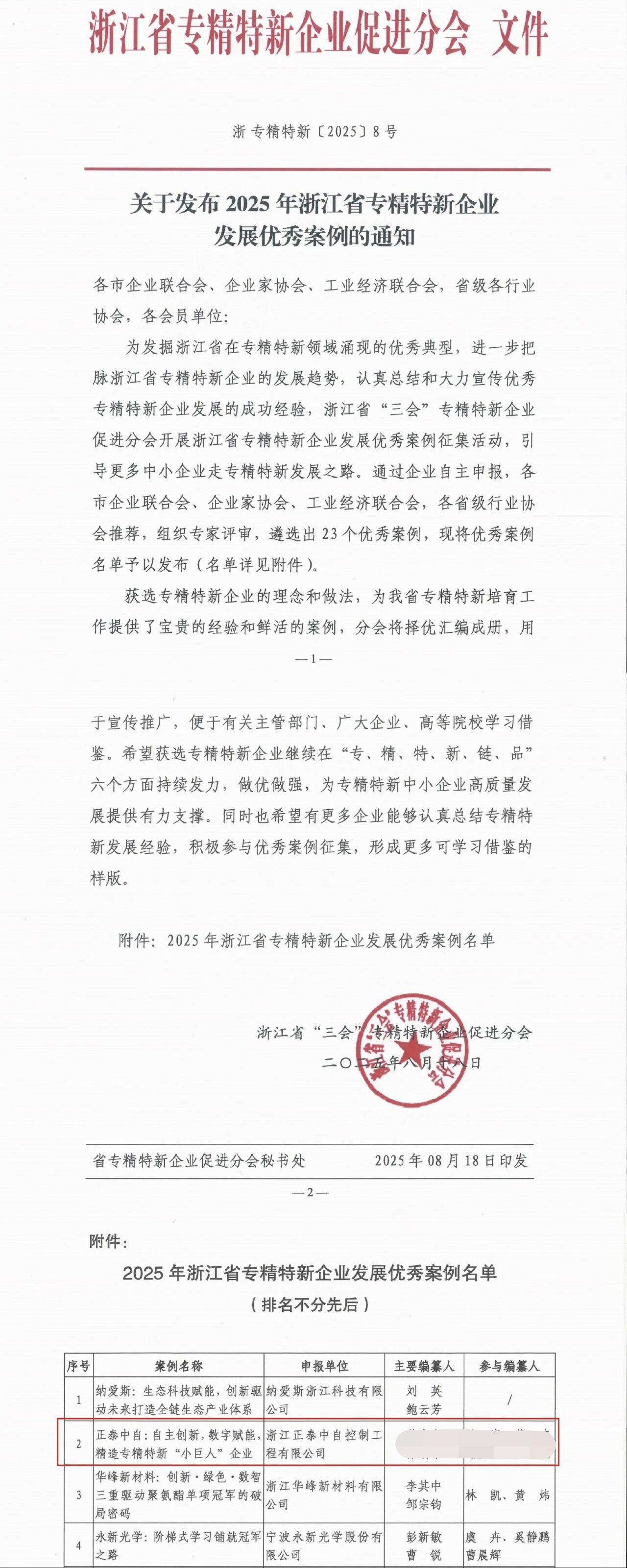 近日,浙江省“三會”專精特新企業促進分會正式發布2025年度浙江省專精特新發展優秀案例名單。正泰中自憑借《自主創新,數字賦能,精造專精特新“小巨人”企業》案例脫穎而出,成功入選該名單,發展路徑與創新實踐獲得官方認可與推介。