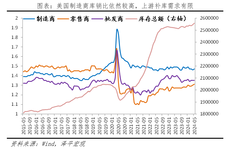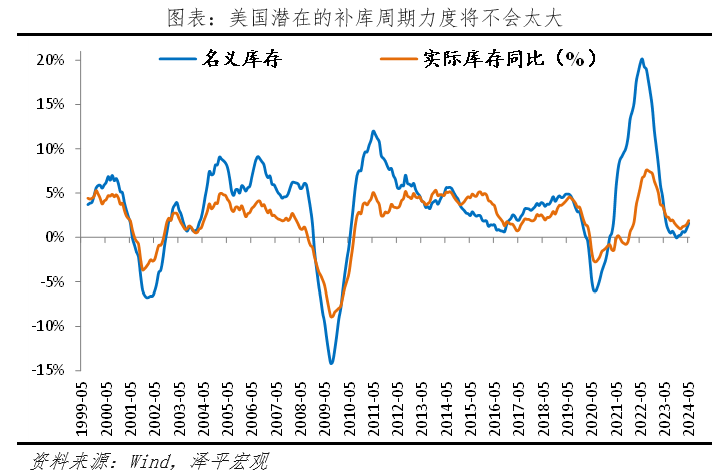 1)美國經濟出現三點放緩信號,但著陸方式尚不確定。一是當前美國家庭儲蓄率出現下滑,高水平的消費支出可能在長期內難以持續;二是長期高利率下,需求不足、新屋開工率下滑,拖累住宅投資和建筑投資。三是補庫周期較弱,從名義庫存的角度看,美國庫存去化較快。但高通脹導致以名義庫存視角判斷補庫力度(涵蓋工業品價格與工業品數量需求)在當前指導意義較差。若從實際庫存來看,美國本輪去庫程度較為有限,本輪補庫強度可以參考2016年底的補庫周期,整體力度不會太大,更多的是行業層面的結構性補庫。
