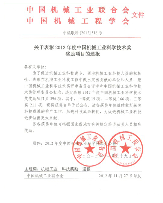 2012年度中國機械工業(yè)科學技術(shù)獎公報