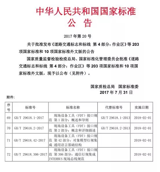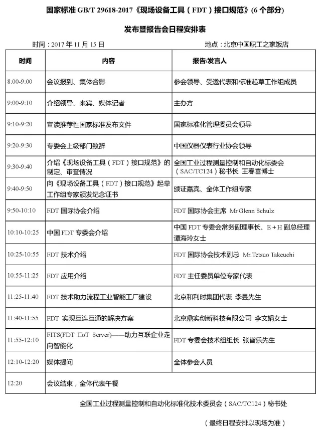 2017年11月15日,國(guó)家標(biāo)準(zhǔn)GB/T 29618-2017現(xiàn)場(chǎng)設(shè)備工具(FDT)接口規(guī)范 (6個(gè)部分)發(fā)布暨報(bào)告會(huì)將在北京舉行。本次發(fā)布會(huì)將由全國(guó)工業(yè)過程測(cè)量控制和自動(dòng)化標(biāo)準(zhǔn)化技術(shù)委員會(huì)(SAC/TC124)主辦,機(jī)械工業(yè)儀器儀表綜合技術(shù)經(jīng)濟(jì)研究所(ITEI)承辦,中國(guó)儀器儀表行業(yè)協(xié)會(huì),FDT專業(yè)委員會(huì)和西南大學(xué)協(xié)辦。