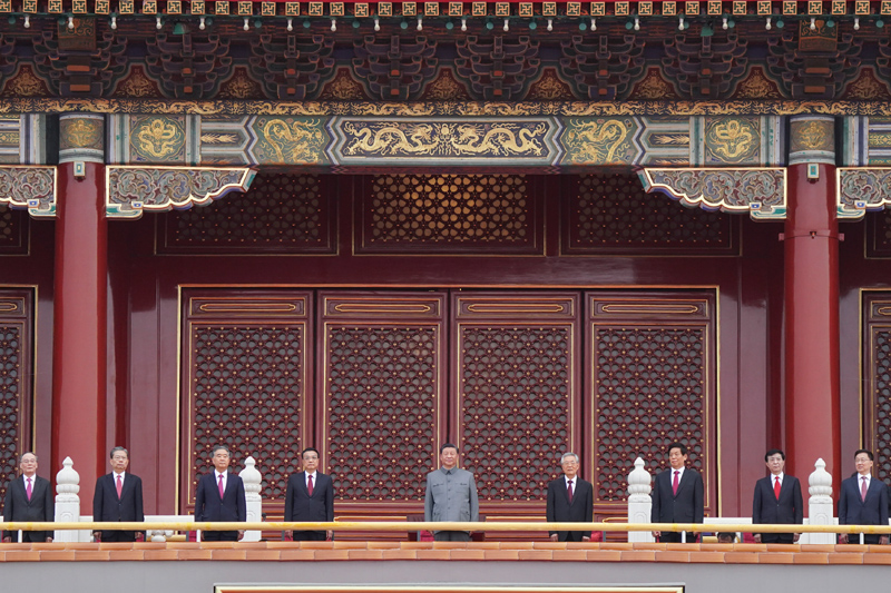 上午7時53分,在歡快的樂曲聲中,習(xí)近平等黨和國家領(lǐng)導(dǎo)人來到天安門城樓主席臺,全場爆發(fā)出熱烈掌聲。