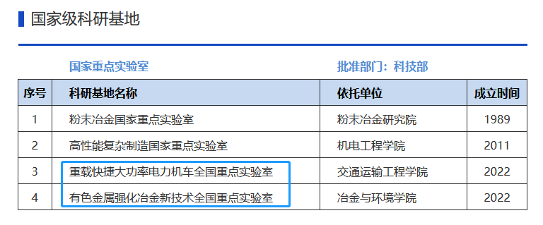 中南大學官網信息顯示,中南大學擁有“重載快捷大功率電力機車全國重點實驗室”和“有色金屬強化冶金新技術全國重點實驗室”;此外,3月15日,中南大學極端服役性能精準制造全國重點實驗室發布《極端服役性能精準制造全國重點實驗室2023年自主研究課題申請指南》,表明中南大學還擁有“極端服役性能精準制造全國重點實驗室”。