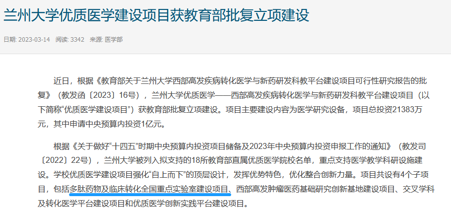 近日,蘭州大學優質醫學建設項目獲教育部批復立項建設,項目共設有4個子項目,包括多肽藥物及臨床轉化全國重點實驗室建設項目、西部高發腫瘤醫藥基礎研究創新基地建設項目、交叉學科及轉化醫學平臺建設項目和優質醫學創新實踐平臺建設項目。