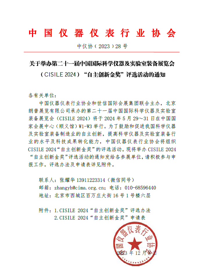 中國儀器儀表行業(yè)協(xié)會(huì)和世信國際會(huì)展集團(tuán)聯(lián)合主辦,北京朗普展覽有限公司承辦的第二十一屆中國國際科學(xué)儀器及實(shí)驗(yàn)室裝備展覽會(huì)(CISILE 2024)將于2024年5月29~31日在中國國家會(huì)展中心(順義館)W1-W3舉行。為了鼓勵(lì)和促進(jìn)我國科學(xué)儀器及實(shí)驗(yàn)室裝備制造業(yè)的自主創(chuàng)新,提高科學(xué)儀器及實(shí)驗(yàn)室裝備行業(yè)的水平及科技成果轉(zhuǎn)化能力,中國儀器儀表行業(yè)協(xié)會(huì)將組織CISILE 2024“自主創(chuàng)新金獎(jiǎng)”的評(píng)選活動(dòng)。現(xiàn)將舉辦CISILE 2024“自主創(chuàng)新金獎(jiǎng)”評(píng)選活動(dòng)的通知發(fā)給各參展單位,請(qǐng)積極參與申報(bào)工作。評(píng)選辦法及申請(qǐng)表詳見附件。