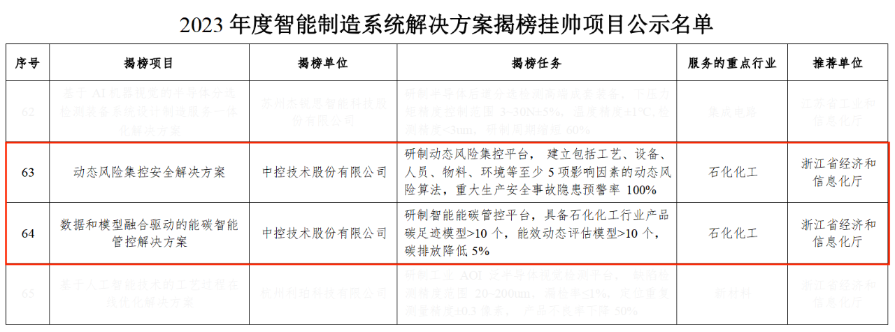 近日,中控技術股份有限公司(以下簡稱“中控技術”)的“動態風險集控安全解決方案”和“數據和模型融合驅動的能碳智能管控解決方案”成功入選國家工信部公示的“2023年度智能制造系統解決方案揭榜掛帥項目名單”。