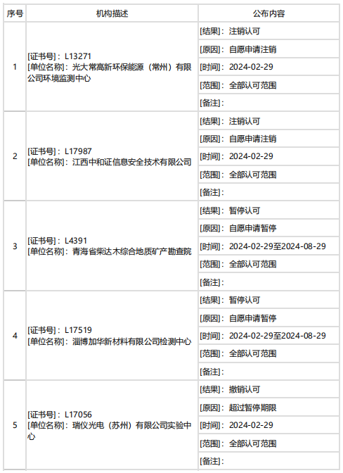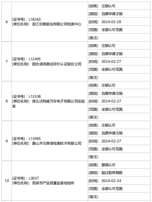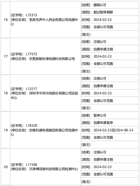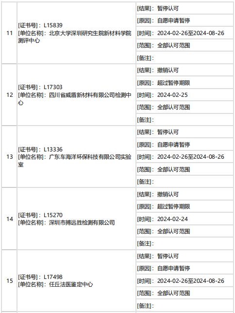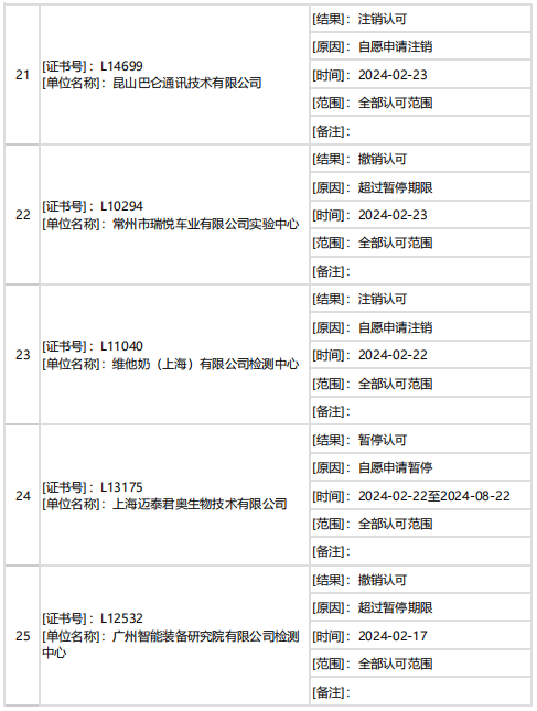 據(jù)中國合格評定國家認可委員會(CNAS)消息,2月下半月共計27家機構(gòu)暫停/撤銷/注銷認可資質(zhì)。7家機構(gòu)因超過暫停期限被撤銷認可,其他機構(gòu)為自愿申請暫停/注銷認可。