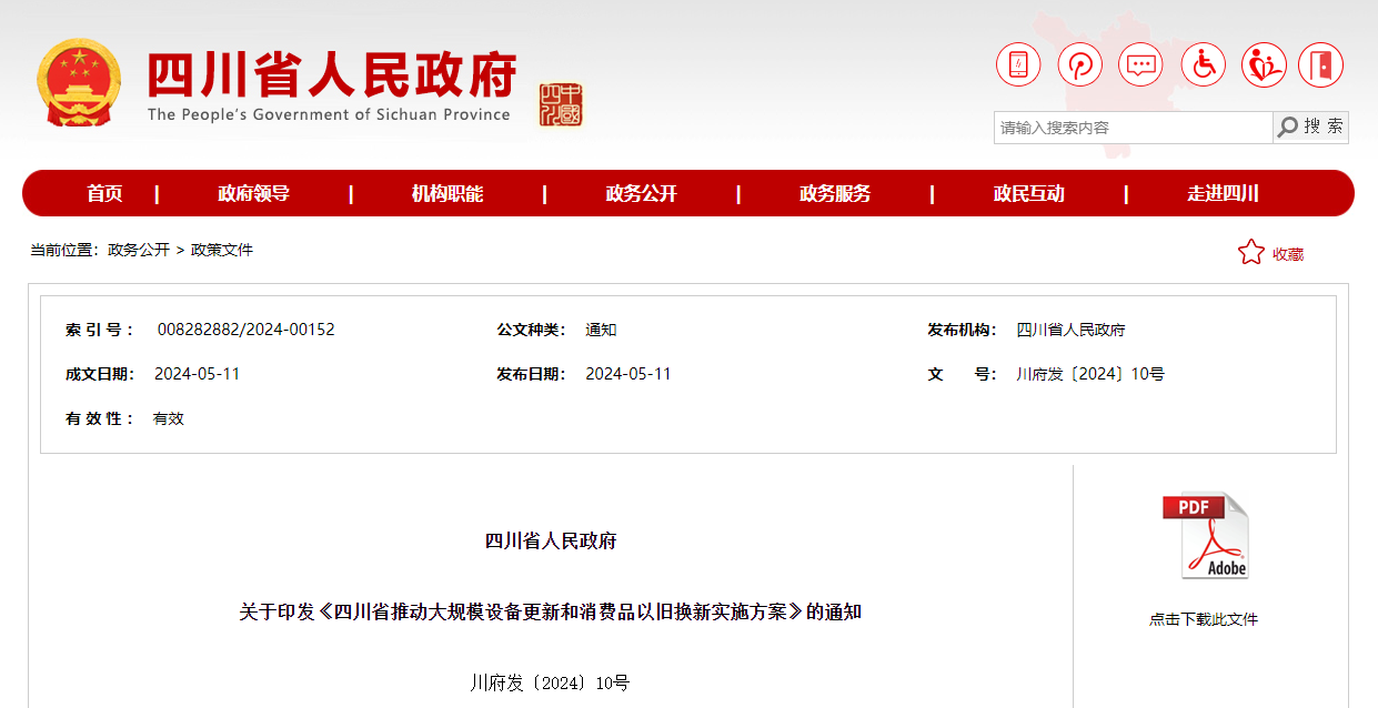 511日四川省人民政府網站發布關于印發《四川省推動大規模設備更新和消費品以舊換新實施方案》的通知。