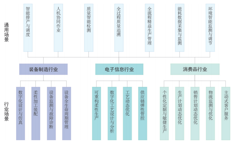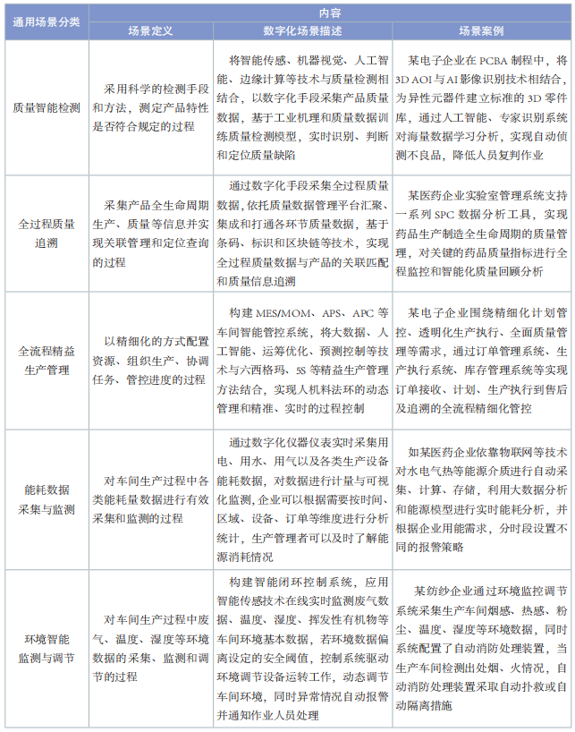 通用場景是指滿足不同行業(yè)數(shù)字化轉(zhuǎn)型共性需求的場景,具備在同行業(yè)內(nèi)及不同行業(yè)間的推廣價(jià)值。通用場景部分整理了裝備制造、電子信息和消費(fèi)品 3 個(gè)行業(yè)存在共性需求和相似解決方案的數(shù)字化典型場景,包括智能排產(chǎn)與調(diào)度、人機(jī)協(xié)同作業(yè)、質(zhì)量智能檢測、全過程質(zhì)量追溯、全流程精益生產(chǎn)管理、能耗數(shù)據(jù)采集與監(jiān)測、環(huán)境智能監(jiān)測與調(diào)節(jié) 7個(gè)場景,場景內(nèi)容見表 1。