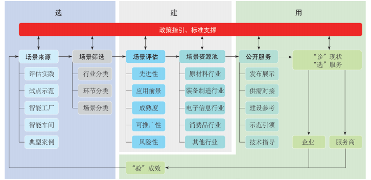 數(shù)字化場景資源池建設(shè)的關(guān)鍵是對外服務(wù),以示范、參考、指導(dǎo)等方式助力企業(yè)數(shù)字化場景建設(shè)。可以通過平臺的方式公開發(fā)布優(yōu)秀場景案例、場景提供方名錄、技術(shù)邏輯方案等信息,為轉(zhuǎn)型企業(yè)和服務(wù)商打造精準(zhǔn)高效的資源獲取和服務(wù)對接平臺。有轉(zhuǎn)型需求的企業(yè)可以通過信息發(fā)現(xiàn)、場景對比分析,“診”自身場景數(shù)字化現(xiàn)狀,快速錨準(zhǔn)具體轉(zhuǎn)型場景,明確轉(zhuǎn)型方案和目標(biāo),同時(shí)“選”優(yōu)秀場景案例指導(dǎo)自身場景數(shù)字化建設(shè)。服務(wù)商可以通過場景對標(biāo)分析,“診”自身數(shù)字化場景方案的成熟度和能力,“選”與自身同方向的優(yōu)秀場景指導(dǎo)方案優(yōu)化,持續(xù)提升服務(wù)能力。企業(yè)和服務(wù)商的成功實(shí)踐通過“驗(yàn)”之后,將不斷轉(zhuǎn)化為資源池的場景來源,形成“選”“建”“用”的良性閉環(huán),不斷豐富資源池場景。