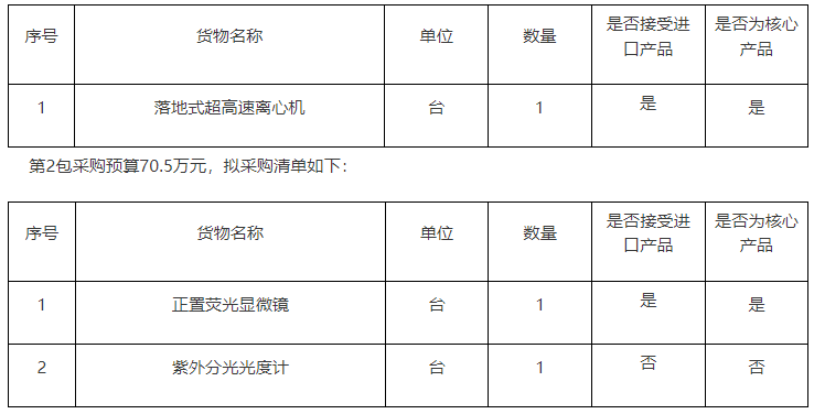 華中師范大學(xué)落地式超高速離心機(jī)、正置熒光顯微鏡、紫外分光光度計(jì)儀器設(shè)備采購(gòu),本項(xiàng)目劃分為2個(gè)包,第1包采購(gòu)預(yù)算77萬(wàn)元,擬采購(gòu)清單如下:
