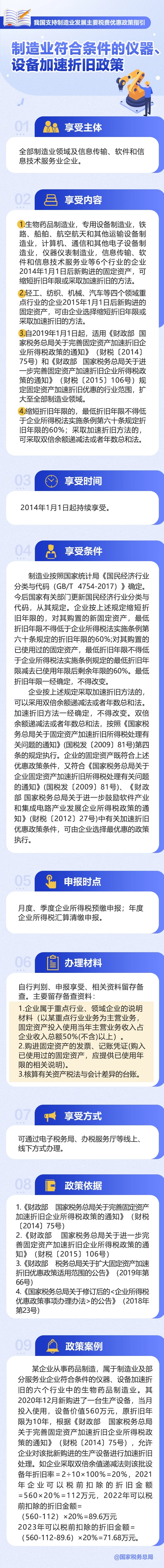 制造業是立國之本、強國之基,是實體經濟的重要組成部分。中央經濟工作會議指出,“落實好結構性減稅降費政策,重點支持科技創新和制造業發展”。為使大家更加全面熟悉了解政策、更加高效準確適用政策,財政部、國家稅務總局近日發布《我國支持制造業發展主要稅費優惠政策指引》。今天帶你了解:制造業符合條件的儀器、設備加速折舊政策。