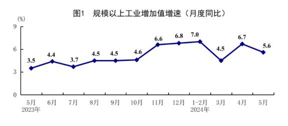 5月份,全國(guó)規(guī)模以上工業(yè)增加值同比增長(zhǎng)5.6%,環(huán)比增長(zhǎng)0.30%。分三大門類看,采礦業(yè)增加值同比增長(zhǎng)3.6%,制造業(yè)增長(zhǎng)6.0%,電力、熱力、燃?xì)饧八a(chǎn)和供應(yīng)業(yè)增長(zhǎng)4.3%。裝備制造業(yè)增加值增長(zhǎng)7.5%,高技術(shù)制造業(yè)增加值增長(zhǎng)10.0%,增速分別快于全部規(guī)模以上工業(yè)1.9和4.4個(gè)百分點(diǎn)。分經(jīng)濟(jì)類型看,國(guó)有控股企業(yè)增加值增長(zhǎng)3.6%;股份制企業(yè)增長(zhǎng)6.4%,外商及港澳臺(tái)投資企業(yè)增長(zhǎng)2.5%;私營(yíng)企業(yè)增長(zhǎng)5.9%。分產(chǎn)品看,3D打印設(shè)備、新能源汽車、集成電路產(chǎn)品產(chǎn)量同比分別增長(zhǎng)36.3%、33.6%、17.3%。1-5月份,全國(guó)規(guī)模以上工業(yè)增加值同比增長(zhǎng)6.2%。5月份,制造業(yè)采購(gòu)經(jīng)理指數(shù)為49.5%,企業(yè)生產(chǎn)經(jīng)營(yíng)活動(dòng)預(yù)期指數(shù)為54.3%。1-4月份,全國(guó)規(guī)模以上工業(yè)企業(yè)實(shí)現(xiàn)利潤(rùn)總額20947億元,同比增長(zhǎng)4.3%。