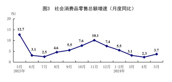 5月份,社會(huì)消費(fèi)品零售總額39211億元,同比增長(zhǎng)3.7%,比上月加快1.4個(gè)百分點(diǎn);環(huán)比增長(zhǎng)0.51%。按經(jīng)營(yíng)單位所在地分,城鎮(zhèn)消費(fèi)品零售額34111億元,同比增長(zhǎng)3.7%;鄉(xiāng)村消費(fèi)品零售額5100億元,增長(zhǎng)4.1%。按消費(fèi)類型分,商品零售34937億元,增長(zhǎng)3.6%;餐飲收入4274億元,增長(zhǎng)5.0%。部分升級(jí)類商品銷售增長(zhǎng)較快,限額以上單位體育、娛樂(lè)用品類,化妝品類,通訊器材類,家用電器和音像器材類商品零售額分別增長(zhǎng)20.2%、18.7%、16.6%和12.9%。1-5月份,社會(huì)消費(fèi)品零售總額195237億元,同比增長(zhǎng)4.1%。全國(guó)網(wǎng)上零售額57669億元,同比增長(zhǎng)12.4%。其中,實(shí)物商品網(wǎng)上零售額48280億元,增長(zhǎng)11.5%,占社會(huì)消費(fèi)品零售總額的比重為24.7%。1-5月份,服務(wù)零售額同比增長(zhǎng)7.9%。