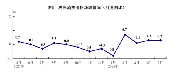 5月份,全國(guó)居民消費(fèi)價(jià)格(CPI)同比上漲0.3%,漲幅與上月持平;環(huán)比下降0.1%。分類別看,食品煙酒價(jià)格同比下降1.0%,衣著價(jià)格上漲1.6%,居住價(jià)格上漲0.2%,生活用品及服務(wù)價(jià)格上漲0.8%,交通通信價(jià)格下降0.2%,教育文化娛樂(lè)價(jià)格上漲1.7%,醫(yī)療保健價(jià)格上漲1.5%,其他用品及服務(wù)價(jià)格上漲3.6%。在食品煙酒價(jià)格中,鮮果價(jià)格下降6.7%,糧食價(jià)格上漲0.5%,鮮菜價(jià)格上漲2.3%,豬肉價(jià)格上漲4.6%。扣除食品和能源價(jià)格后的核心CPI同比上漲0.6%。1-5月份,全國(guó)居民消費(fèi)價(jià)格同比上漲0.1%。