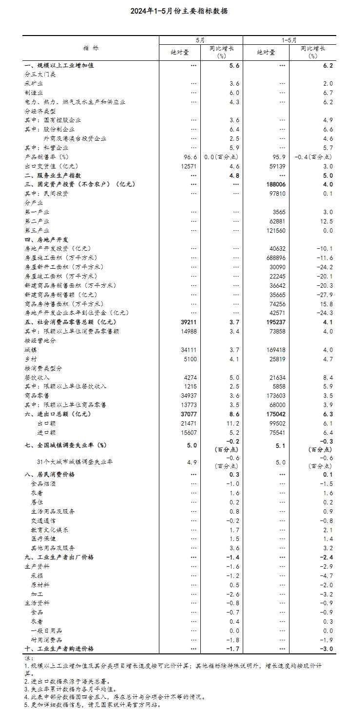 5月份,在以習(xí)近平同志為核心的黨中央堅(jiān)強(qiáng)領(lǐng)導(dǎo)下,各地區(qū)各部門認(rèn)真貫徹落實(shí)黨中央、國(guó)務(wù)院決策部署,堅(jiān)持穩(wěn)中求進(jìn)工作總基調(diào),完整、準(zhǔn)確、全面貫徹新發(fā)展理念,加快構(gòu)建新發(fā)展格局,扎實(shí)推動(dòng)高質(zhì)量發(fā)展,國(guó)民經(jīng)濟(jì)延續(xù)回升向好態(tài)勢(shì),生產(chǎn)穩(wěn)定增長(zhǎng),需求持續(xù)恢復(fù),就業(yè)物價(jià)總體穩(wěn)定,國(guó)際收支平衡,轉(zhuǎn)型升級(jí)持續(xù),運(yùn)行總體平穩(wěn)。