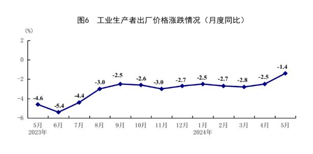 5月份,全國(guó)工業(yè)生產(chǎn)者出廠價(jià)格同比下降1.4%,降幅比上月收窄1.1個(gè)百分點(diǎn);環(huán)比上漲0.2%。全國(guó)工業(yè)生產(chǎn)者購(gòu)進(jìn)價(jià)格同比下降1.7%,環(huán)比上漲0.3%。1-5月份,全國(guó)工業(yè)生產(chǎn)者出廠價(jià)格和購(gòu)進(jìn)價(jià)格同比分別下降2.4%和3.0%。