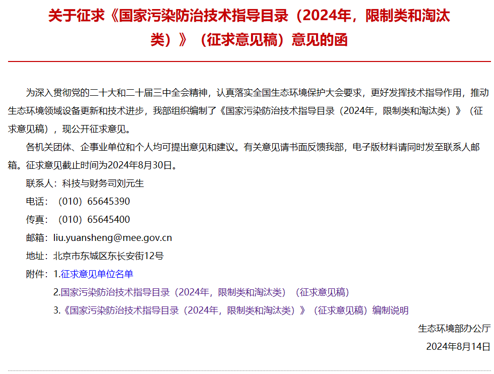 為更好發(fā)揮技術(shù)指導(dǎo)作用,推動生態(tài)環(huán)境領(lǐng)域設(shè)備更新和技術(shù)進步,生態(tài)環(huán)境部日前發(fā)布關(guān)于征求《國家污染防治技術(shù)指導(dǎo)目錄(2024年,限制類和淘汰類)》(征求意見稿)意見的函,向有關(guān)單位征求意見。