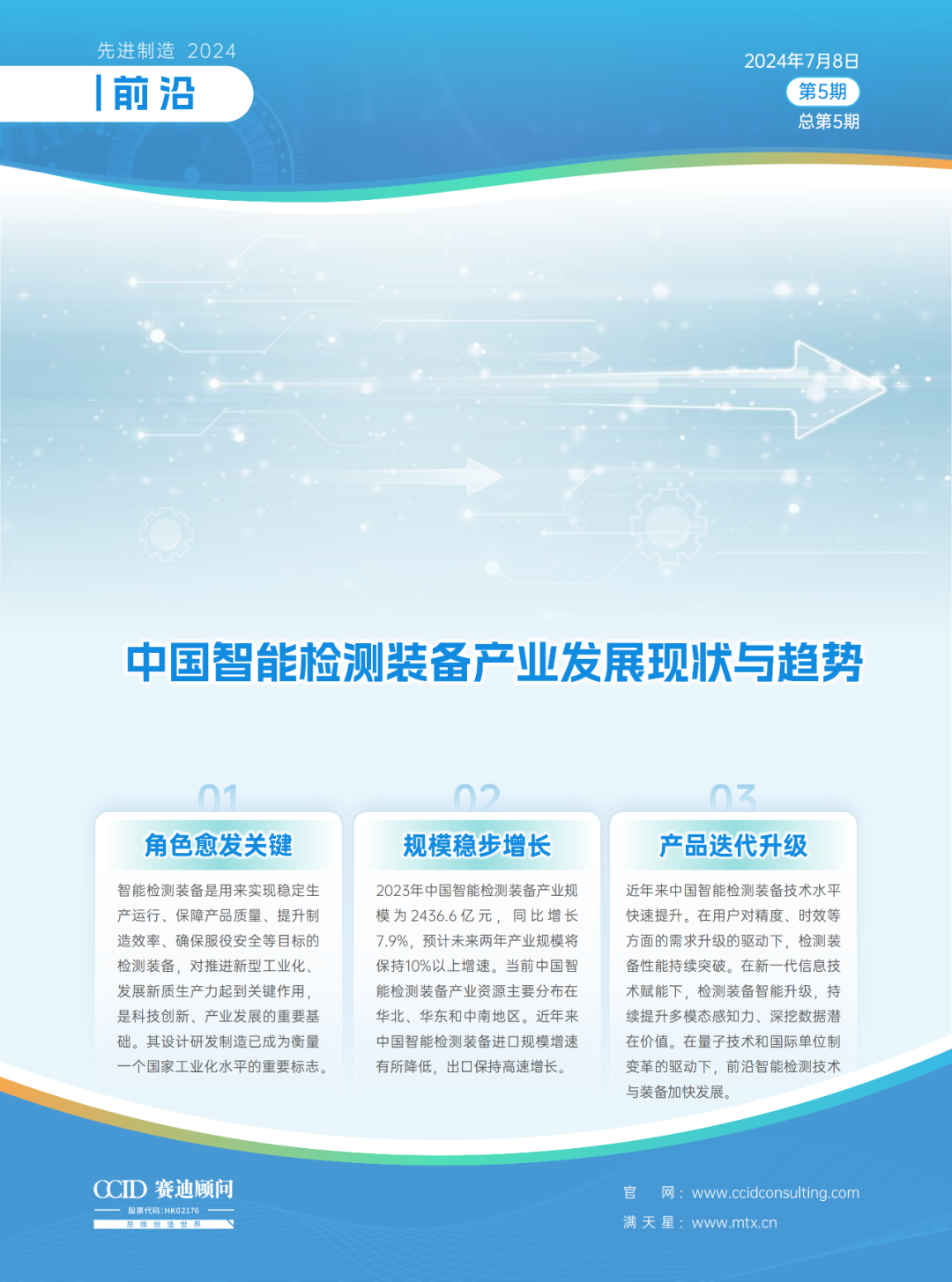 2023年中國智能檢測裝備產(chǎn)業(yè)規(guī)模為2436.6億元,較上年增長7.9%。受國家推進(jìn)新型工業(yè)化、發(fā)展新質(zhì)生產(chǎn)力、加快工業(yè)設(shè)備更新等利好政策影響,預(yù)計(jì)未來幾年將持續(xù)保持10%以上的增速,2025年整體產(chǎn)業(yè)規(guī)模將突破3000億元。隨著智能制造深入推進(jìn),智能檢測裝備需求日益增加,新技術(shù)新產(chǎn)品競相涌現(xiàn),產(chǎn)業(yè)呈現(xiàn)快速發(fā)展勢頭。總體來看中國智能檢測裝備產(chǎn)業(yè)仍存在技術(shù)基礎(chǔ)薄弱、創(chuàng)新能力不強(qiáng)、高端供給不足、產(chǎn)業(yè)體系不完善和應(yīng)用生態(tài)不健全等問題,已成為智能制造深入發(fā)展的關(guān)鍵短板和重要制約。黨的二十屆三中全會公報(bào)指出,高質(zhì)量發(fā)展是全面建設(shè)社會主義現(xiàn)代化國家的首要任務(wù)。推進(jìn)智能檢測裝備發(fā)展是產(chǎn)業(yè)基礎(chǔ)高級化的重要領(lǐng)域,對推進(jìn)產(chǎn)業(yè)實(shí)現(xiàn)歷史性變革、系統(tǒng)性重塑、整體性重構(gòu)具有重要價(jià)值。工信部等部門出臺的《智能檢測裝備產(chǎn)業(yè)發(fā)展行動(dòng)計(jì)劃(2023-2025年)》等一系列政策,提出了“到2025年,智能檢測技術(shù)基本滿足用戶領(lǐng)域制造工藝需求,核心零部件、專用軟件和整機(jī)裝備供給能力顯著提升,重點(diǎn)領(lǐng)域智能檢測裝備示范帶動(dòng)和規(guī)模應(yīng)用成效明顯,產(chǎn)業(yè)生態(tài)初步形成“等發(fā)展目標(biāo)。