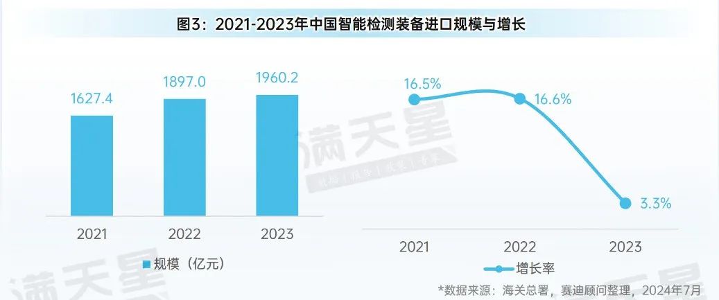 圖3:2021-2023年中國智能檢測裝備進(jìn)口規(guī)模與增長