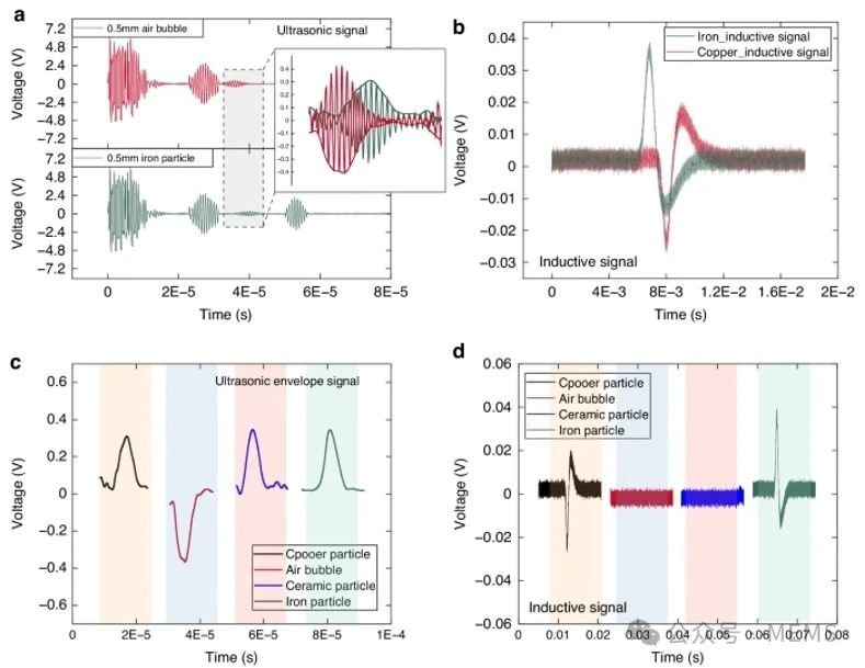 綜上所述,這項研究提出了一種集成超聲單元和電磁感應單元的傳感方法,用于實時檢測管道內的各種污染物和流速。超聲波單元包括一個通過微機械技術制備的柔性換能器貼片,不僅便于安裝,還能聚焦聲場。此外,電磁傳感單元包含三個對稱分布的電磁線圈。通過對超聲波和電磁感應信號的綜合分析,該方法可以有效地區分磁性金屬(如鐵)、非磁性金屬(如銅)、非金屬顆粒(如陶瓷)和氣泡。這種全面的分類幾乎涵蓋了管道中可能存在的所有污染物類型。此外,通過超聲多普勒頻移可以確定流體速度。通過數學模型和有限元仿真驗證了所提出的檢測原理的有效性。在直徑14 mm的管道內,研究人員對各種不同速度的污染物進行了系統地測試。實驗結果表明,該傳感器能夠有效檢測0.5 ~ 3 mm范圍內的污染物,準確區分污染物類型,并測量其流速。這項研究的影響可以擴展到工業、航空航天和臨床醫學等多個領域,因此具有更廣泛及深遠的意義。