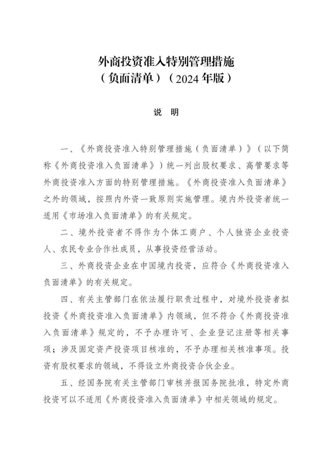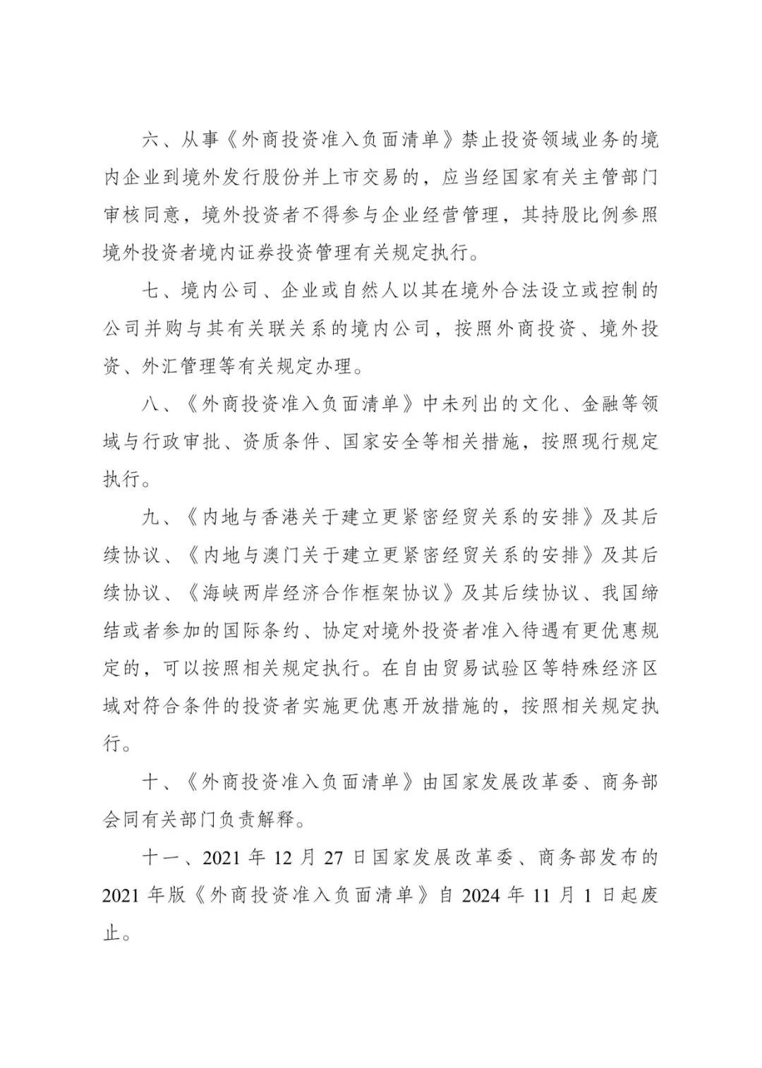 經(jīng)黨中央、國務(wù)院同意,國家發(fā)展改革委、商務(wù)部于2024年9月8日發(fā)布第23號(hào)令,全文發(fā)布《外商投資準(zhǔn)入特別管理措施(負(fù)面清單)(2024年版)》,自2024年11月1日起施行。《外商投資準(zhǔn)入特別管理措施(負(fù)面清單)(2021年版)》同時(shí)廢止。