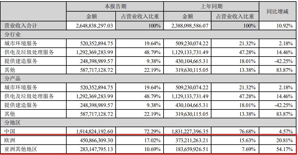 率先布局海外市場的中國環(huán)保企業(yè)已獲得的成果,也驗證了海外市場是當前非常廣闊的增量空間。根據(jù)中國天楹的半年度報告,海外業(yè)務占營業(yè)收入比重增幅已遠超國內業(yè)務,增長潛力值得期待。