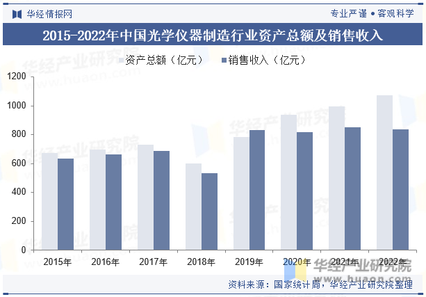 根據(jù)國(guó)家統(tǒng)計(jì)局?jǐn)?shù)據(jù),近年來(lái)我國(guó)光學(xué)儀器制造行業(yè)資產(chǎn)總額及銷售收入總體呈現(xiàn)出增長(zhǎng)態(tài)勢(shì),2015-2022年,行業(yè)資產(chǎn)總額由674.99億元增長(zhǎng)至1072.58億元,CAGR為6.84%,行業(yè)銷售收入由632.65億元增長(zhǎng)至835.72,CAGR為4.06%。