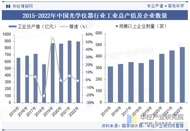 在電子技術(shù)和計(jì)算機(jī)行業(yè)發(fā)展的帶動(dòng)下并伴隨著下游應(yīng)用領(lǐng)域需求的日益增長(zhǎng),使得國(guó)內(nèi)光學(xué)儀器制造行業(yè)市場(chǎng)規(guī)模持續(xù)擴(kuò)張。據(jù)統(tǒng)計(jì),2022年中國(guó)光學(xué)儀器制造行業(yè)工業(yè)總產(chǎn)值稍有下滑,為898.23億元,同比減少1.38%。我國(guó)光學(xué)儀器制造行業(yè)規(guī)模以上企業(yè)數(shù)量逐年攀升,2015年光學(xué)儀器制造行業(yè)規(guī)模以上企業(yè)數(shù)量為314家,2022年提升至482家。