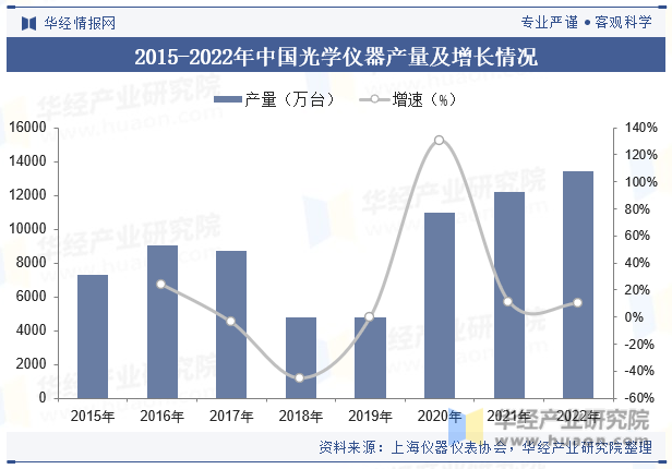 光學(xué)儀器是儀器儀表行業(yè)中非常重要的組成類別,從產(chǎn)量來(lái)看,近幾年國(guó)內(nèi)光學(xué)儀器產(chǎn)量大幅增長(zhǎng),2020年中國(guó)光學(xué)儀器產(chǎn)量突破1億臺(tái),同比增速達(dá)130.35%,2022年產(chǎn)量增長(zhǎng)至1.35億臺(tái),同比上漲10.05%。