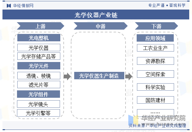 我國(guó)光學(xué)儀器行業(yè)產(chǎn)業(yè)鏈上游主要包括光電整機(jī)、光學(xué)元件以及光學(xué)組件供應(yīng)商;中游為光學(xué)儀器生產(chǎn)制造環(huán)節(jié),下游應(yīng)用領(lǐng)域廣泛,是工農(nóng)業(yè)生產(chǎn)、資源勘探空間探索、科學(xué)實(shí)驗(yàn)、國(guó)防建設(shè)以及社會(huì)生活各個(gè)領(lǐng)域不可缺少的觀察、測(cè)試分析、控制、記錄和傳遞的工具。