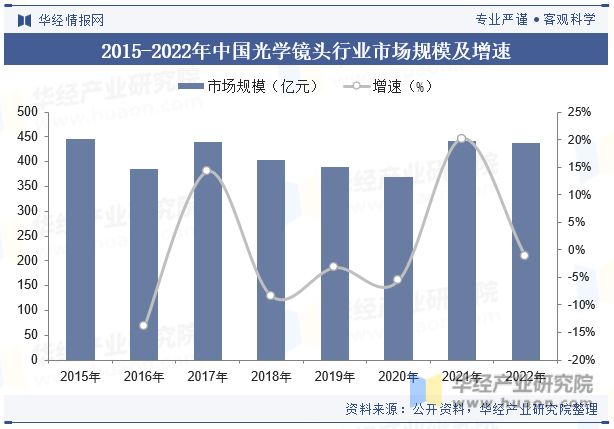 鏡頭是光學(xué)儀器的核心部件,20世紀(jì)以來(lái)光電子技術(shù)的快速發(fā)展帶動(dòng)光學(xué)鏡頭的應(yīng)用范圍從最初的顯微鏡、望遠(yuǎn)鏡、膠片相機(jī)等領(lǐng)域向安防視頻監(jiān)控、數(shù)碼相機(jī)/攝像機(jī)和智能手機(jī)等領(lǐng)域滲透。數(shù)據(jù)顯示,2022年我國(guó)光學(xué)鏡頭行業(yè)市場(chǎng)規(guī)模約為437.49億元,同比減少1.16%。