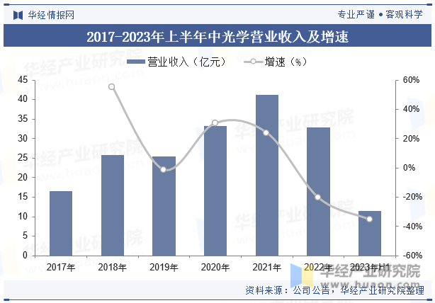 中光學(xué)集團(tuán)成立于1991年,是中國(guó)光學(xué)儀器行業(yè)的領(lǐng)先企業(yè)之一。公司總部位于北京,擁有多個(gè)制造基地和研發(fā)中心,先后榮獲多項(xiàng)級(jí)獎(jiǎng)項(xiàng),是中國(guó)光學(xué)儀器行業(yè)的標(biāo)志性企業(yè)。2022年受疫情反復(fù)、芯片短缺等綜合因素影響,營(yíng)業(yè)收入下降至32.85億元,同比縮減20.44%,2023年上半年實(shí)現(xiàn)營(yíng)收11.5億元,較2022年同比減少35.54%。