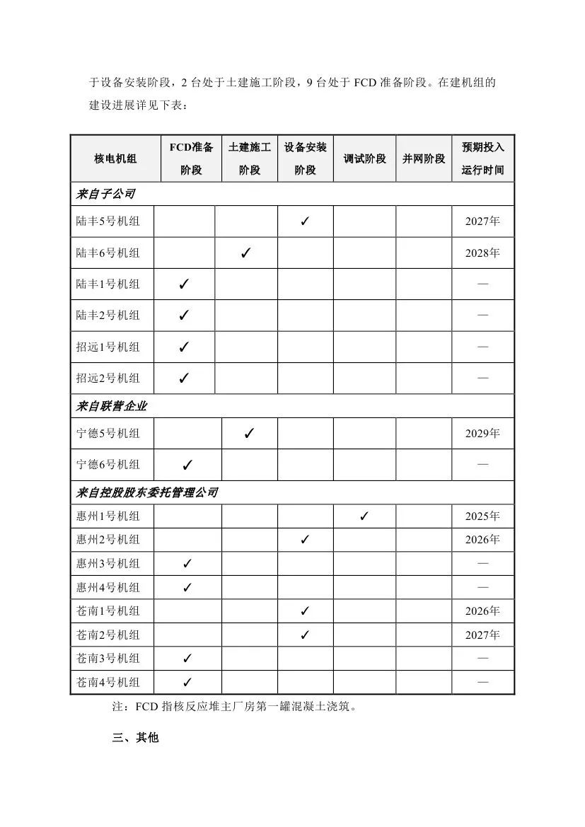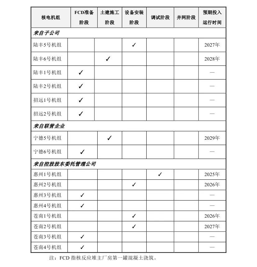 中國(guó)廣核表示,截至2024年9月30日,本集團(tuán)共管理16臺(tái)已核準(zhǔn)待FCD及在建核電機(jī)組(包括本公司控股股東委托本公司管理的8臺(tái)機(jī)組),1臺(tái)處于調(diào)試階段,4臺(tái)處于設(shè)備安裝階段,2臺(tái)處于土建施工階段,9臺(tái)處于FCD準(zhǔn)備階段。在建機(jī)組的建設(shè)進(jìn)展詳見(jiàn)下表: