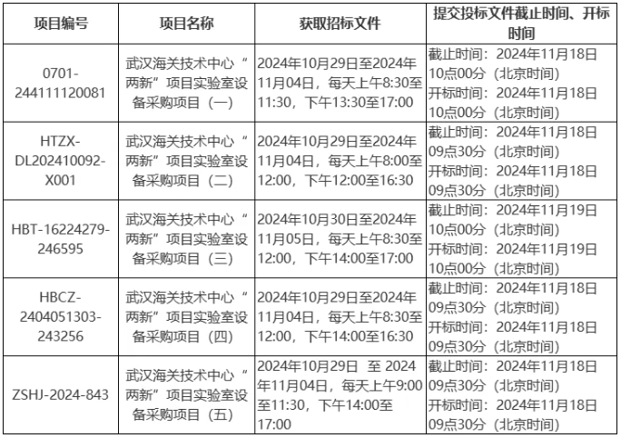 近日,武漢海關技術中心就武漢海關技術中心兩新項目實驗室設備采購項目發布五則公開招標公告,預算金額共計2740萬元。項目的的潛在投標人應在武漢市江岸區金橋大道107號凱信大廈1號樓2105室獲取招標文件。