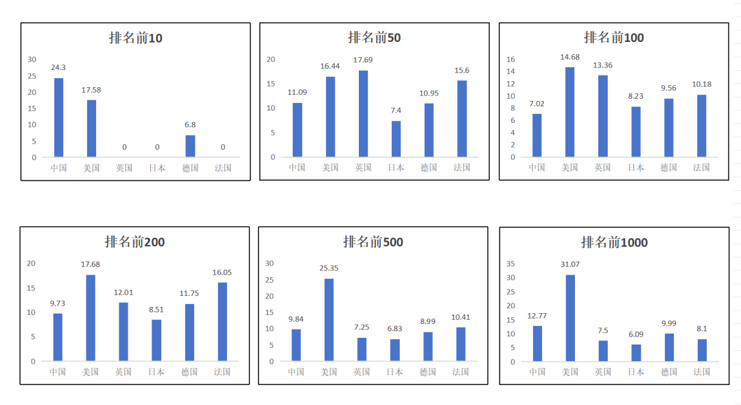 根據(jù)2023年數(shù)據(jù),科技領(lǐng)軍企業(yè)主要國家為中國、美國、英國、日本、德國和法國等。本文對這些國家分段(排名前10、前50、前100、前200、前500與前1000)比較科技領(lǐng)軍企業(yè)數(shù)量、研發(fā)投入總額、平均研發(fā)投入總額與平均研發(fā)投入強度,并比較各國的科技領(lǐng)軍企業(yè)研發(fā)投入最高值與最低值情況。所得到的結(jié)果如圖1~5所示。