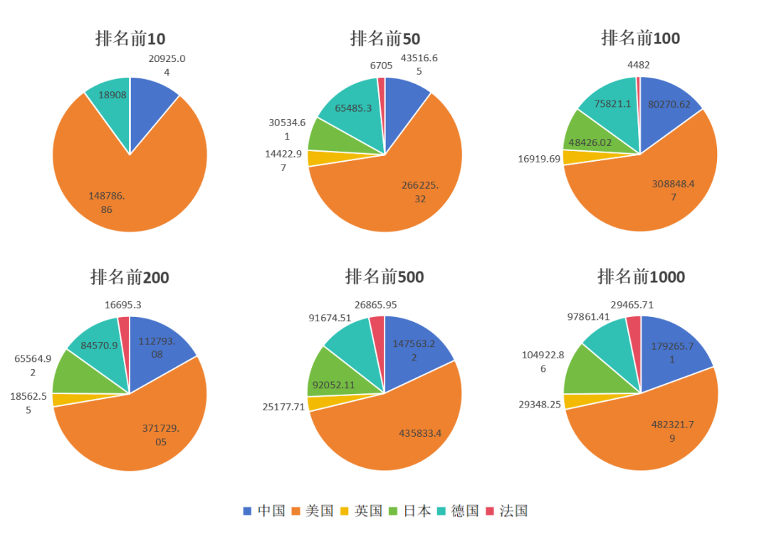 在平均研發(fā)投入總額上,中國科技領(lǐng)軍企業(yè)表現(xiàn)出了與前兩者截然相反的統(tǒng)計特征。在排名前10的分段中,憑借著華為這一家科技領(lǐng)軍企業(yè),中國的平均研發(fā)投入水平占據(jù)了約三分之一的比例,略遜于美國。而隨著分段的逐漸向后擴大,中國科技領(lǐng)軍企業(yè)所占比例逐漸下降,在排名前1000的分段中其所占比例甚至位于六國之末。