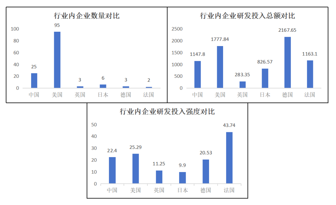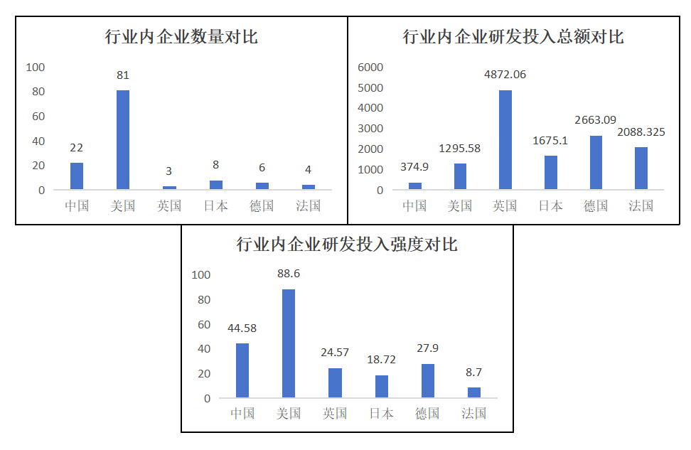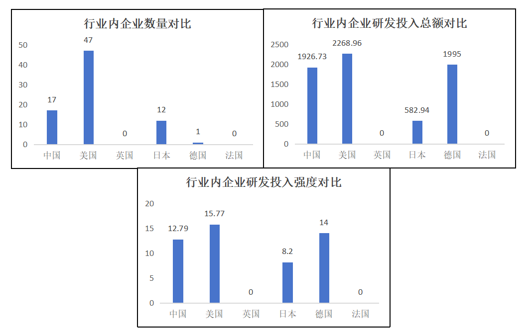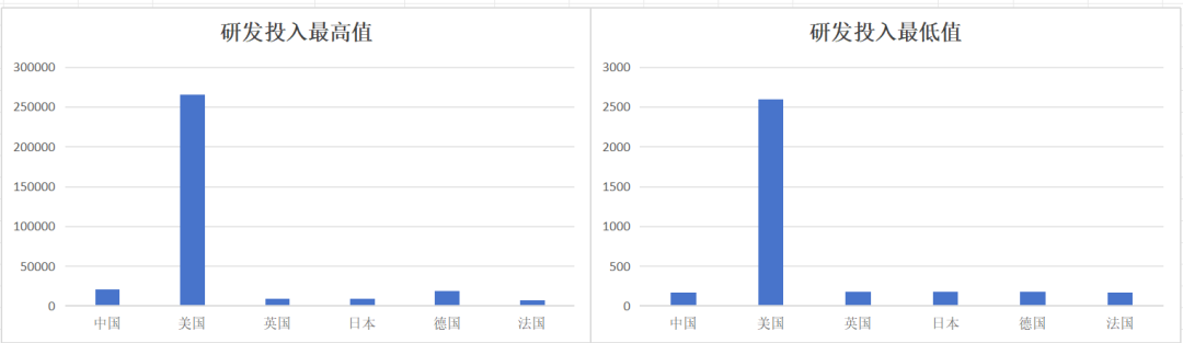 在研發(fā)投入最高值與最低值的比較上,中國科技領(lǐng)軍企業(yè)基本與主要國家持平,但與美國相比有差距十分明顯。