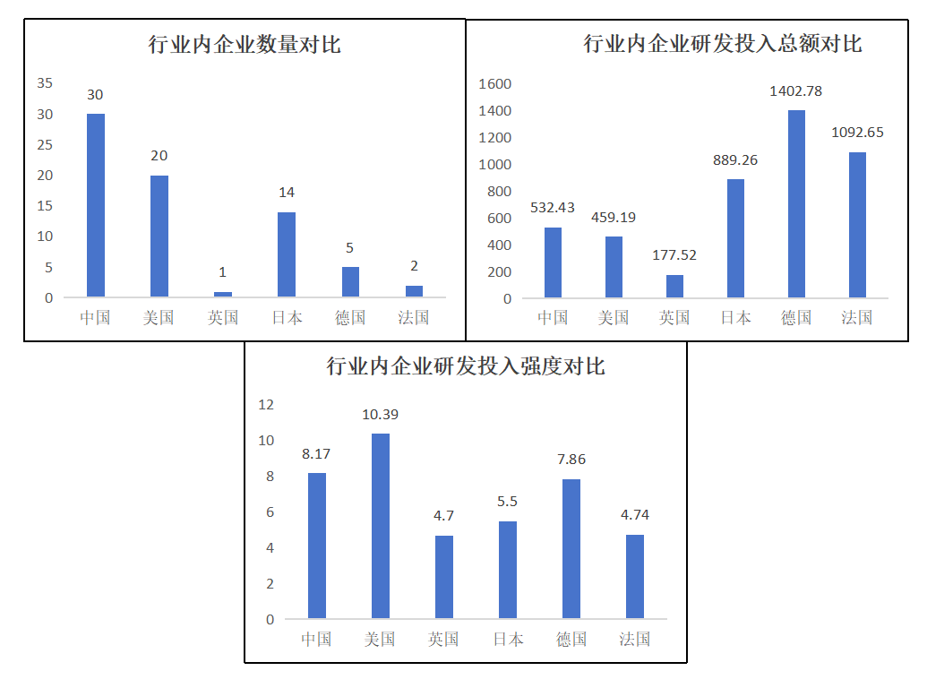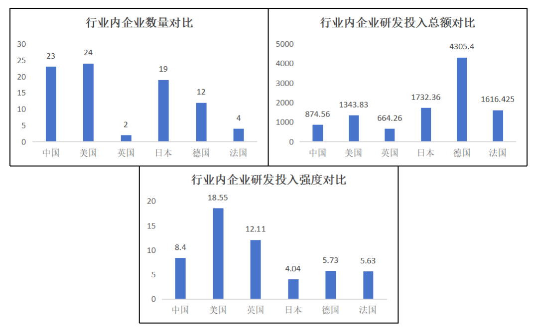 四是汽車和零部件行業(yè)上,中國科技領(lǐng)軍企業(yè)的數(shù)量優(yōu)勢并不明顯;其平均研發(fā)投入總額僅略高于英國,處于較低的水平;其平均研發(fā)投入強度則大約處于中等偏上的水平。總之,中國科技領(lǐng)軍企業(yè)在汽車和零部件行業(yè)上的發(fā)展比較一般,體量優(yōu)勢不明顯,創(chuàng)新水平不高;在平均研發(fā)投入總額較低的情況下卻有著較高的平均研發(fā)投入強度,更是說明了我國汽車和零部件行業(yè)的營收情況不容樂觀。