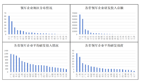 科技領(lǐng)軍企業(yè)在各省市的數(shù)量分布情況與其研發(fā)投入總額在各省市的分布情況相似,這兩個指標都能反映出各省市科技領(lǐng)軍企業(yè)的體量。由圖可知,北京和廣東兩地的科技領(lǐng)軍企業(yè)數(shù)量最多,總研發(fā)投入體量也最大,遠超其他省市;山東省和以上海為核心的長三角地區(qū)也具有很高的科技領(lǐng)軍企業(yè)數(shù)量和研發(fā)投入體量。山西、遼寧、天津的科技領(lǐng)軍企業(yè)數(shù)量較少,總研發(fā)投入體量也相對較低。