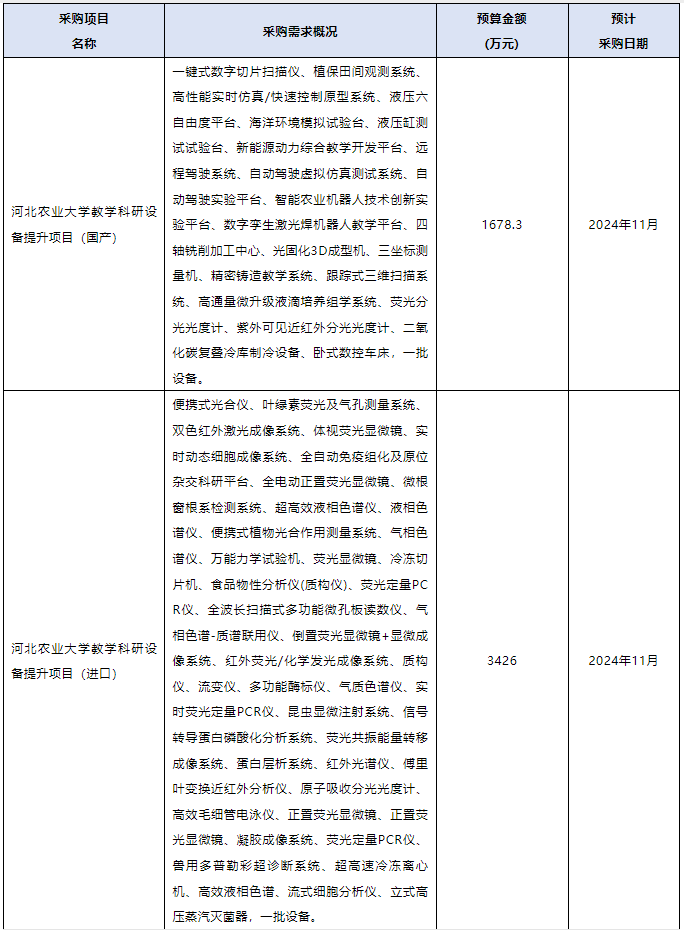 近期,河北農業大學連續發布兩項儀器設備采購意向,預算金額達5104.3萬元。涉及儀器設備包括紫外可見近紅外分光光度計、便攜式光合儀、全電動正置熒光顯微鏡、超高效液相色譜儀、冷凍切片機、多功能酶標儀、超高速冷凍離心機等。預計采購時間2024年11月。