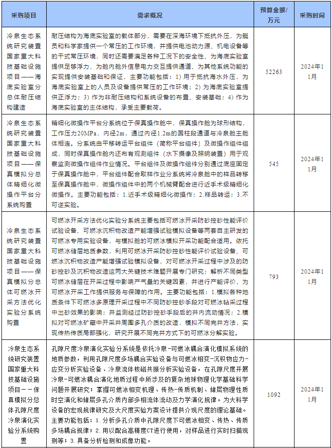 近日,中國科學院南海海洋研究所發布8項儀器設備采購意向,預算總額達5.61億元,涉及海底實驗室分總體耐壓結構建造、保真模擬分總體精細化微操作平臺分系統、保真模擬分總體可燃冰開采方法優化實驗分系統、保真模擬分總體孔隙尺度冷泉演化實驗分系統等,預計采購時間為2024年11~12月。