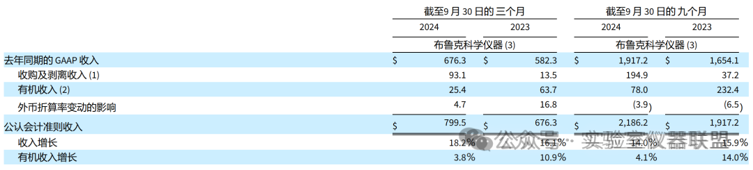 根據(jù)報(bào)告,布魯克 2024 年第三季度的收入為 8.644 億美元,與 2023 年第三季度的 7.428 億美元相比增長(zhǎng) 16.4%。2024 年第三季度,收入同比有機(jī)增長(zhǎng) 3.1%,固定匯率 (CER) 收入增長(zhǎng) 15.7%。收購(gòu)收入增長(zhǎng) 12.5%,外幣折算產(chǎn)生 0.7% 的有利影響。