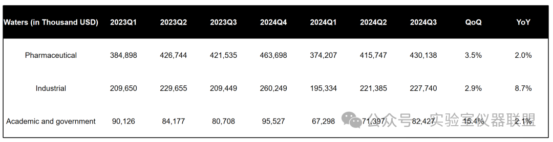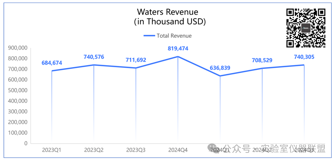 Waters2024Q3財(cái)報(bào)顯示,公司本季度營(yíng)收7.40億美元,超過(guò)此前指引,同比增長(zhǎng)4%。凈利潤(rùn)1.615億美元,同比大增20%。值得注意的是,根據(jù)Waters財(cái)報(bào),2024Q1/Q2期營(yíng)收均同比下滑,尤其是Q1更是大幅下降。