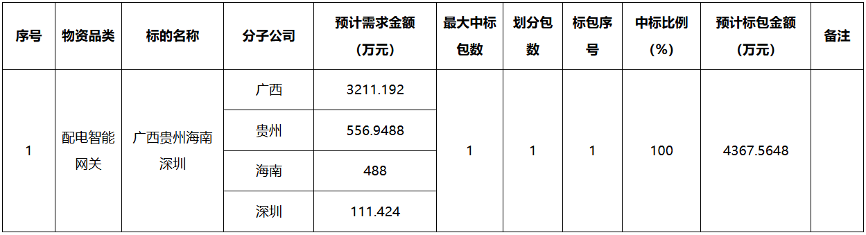 2.1項目概述:按公司2024年集團物資集中采購工作安排,廣西、貴州、海南電網公司和深圳供電局等單位申報了配電智能網關的需求,現組織開展本批次的框架招標工作。