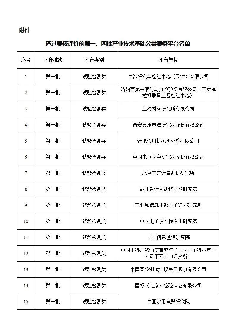 工業(yè)和信息化部辦公廳關(guān)于公布通過復(fù)核評價的第一、四批產(chǎn)業(yè)技術(shù)基礎(chǔ)公共服務(wù)平臺名單的通知