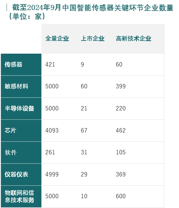 截至20249月,中國智能傳感器全產業鏈企業數量達到2.0萬家,其中,上市企業227家、高新技術企業2215家。十五五時期,隨著物聯網、人工智能、智能制造等領域的快速發展,中國智能傳感器在智能家居、可穿戴設備、智能移動終端等新興領域的應用將不斷增加。
