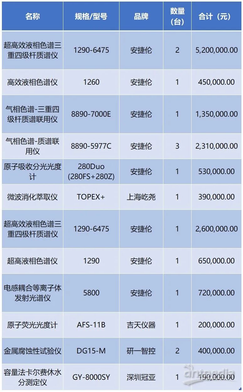 烏魯木齊海關(guān)近日再次發(fā)布關(guān)于海關(guān)實(shí)驗(yàn)室儀器設(shè)備更新項(xiàng)目中標(biāo)公告,本次采購(gòu)的16臺(tái)設(shè)備涉及超高效液相色譜三重四級(jí)桿質(zhì)譜儀、氣相色譜-三重四級(jí)桿質(zhì)譜聯(lián)用儀、電感耦合等離子體發(fā)射光譜儀等一批分析測(cè)試設(shè)備,安捷倫、上海屹堯、吉天儀器等品牌中標(biāo),其中安捷倫占據(jù)11臺(tái)。