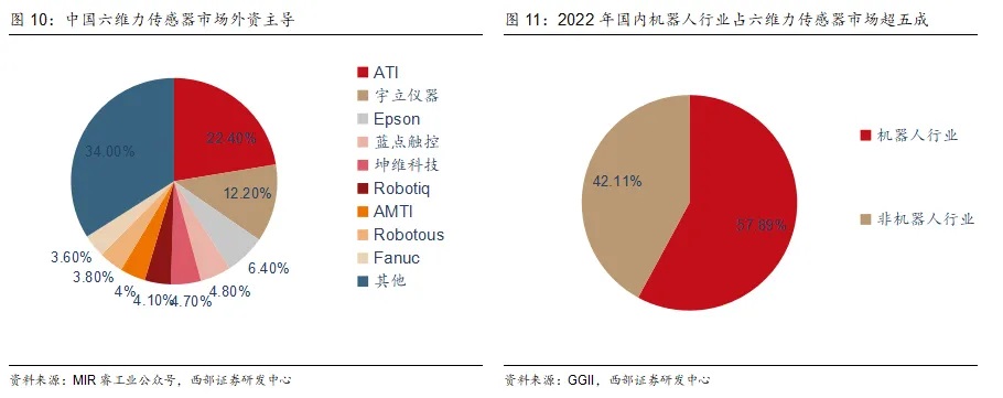 據此前MIR睿工業《2024中國六維力傳感器市場報告》顯示,2023年中國六維力傳感器出貨量不足萬臺,出貨規模剛剛突破2億元,主要應用于機器人、工業自動化和汽車等行業,其市場集中度較高,TOP10廠商占接近70%份額,國產宇立儀器、藍點觸控、坤維科技位列市場份額第二、四、五位。中國六維力傳感器市場仍為外資主導。