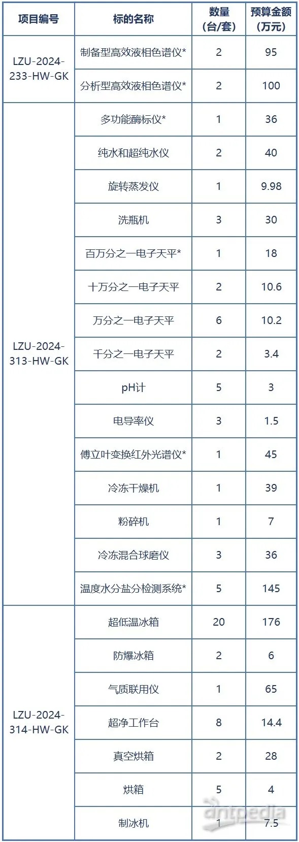 近日,蘭州大學(xué)發(fā)布了一批招標(biāo)公告,涉及多個(gè)領(lǐng)域和項(xiàng)目。共招標(biāo)設(shè)備包括高效液相色譜儀、酶標(biāo)儀、電子天平、傅立葉變換紅外光譜儀等,總預(yù)算為930.58萬元。以下是詳細(xì)信息: